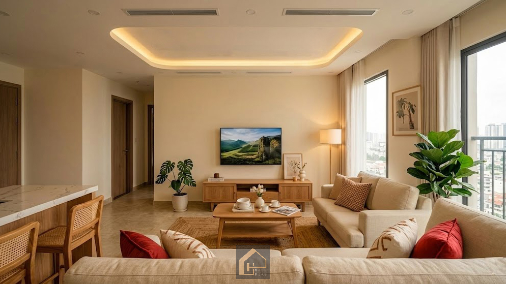 Hãy sử dụng trần thạch cao giật cấp nhẹ nhàng với các đường bo cong thay vì góc vuông. Điều này giúp xóa bỏ sự thô cứng của các khối bê tông, tạo cảm giác trần nhà cao và mềm mại hơn.