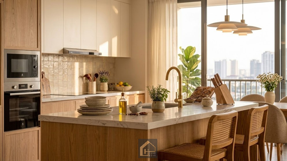 Đối với các căn hộ hiện đại, việc phá bỏ ranh giới giữa phòng khách và phòng bếp là chìa khóa để tạo sự thông thoáng. Japandi đề cao sự luân chuyển của năng lượng và ánh sáng.