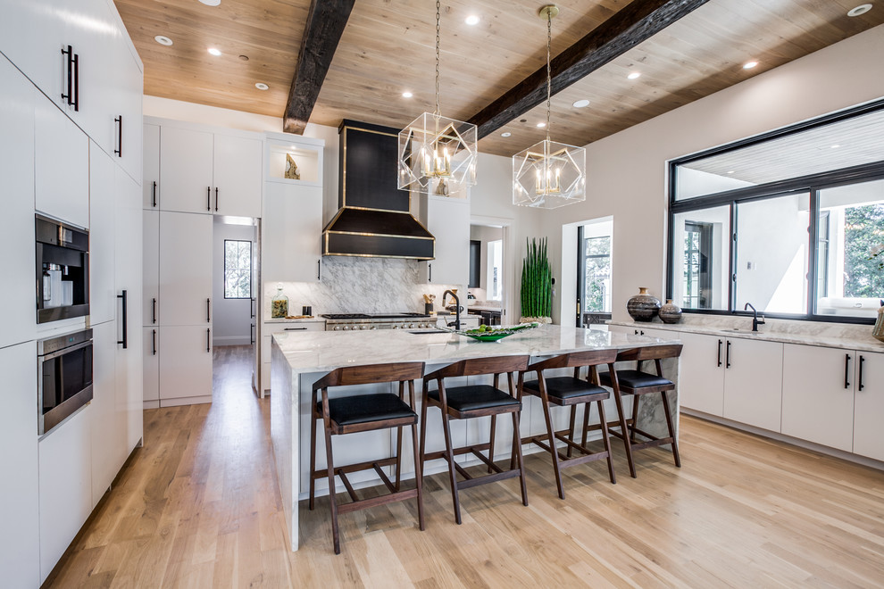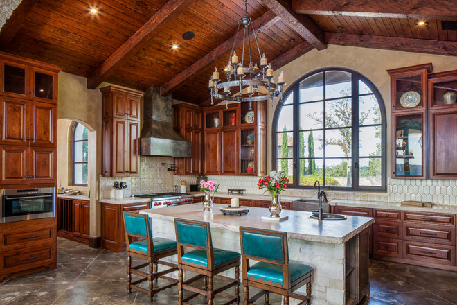 Trần phòng bếp theo phong cách Địa Trung Hải thông thường sẽ được trang trí một cách mộc mạc như dầm gỗ hoặc sắt lộ ra ngoài.
