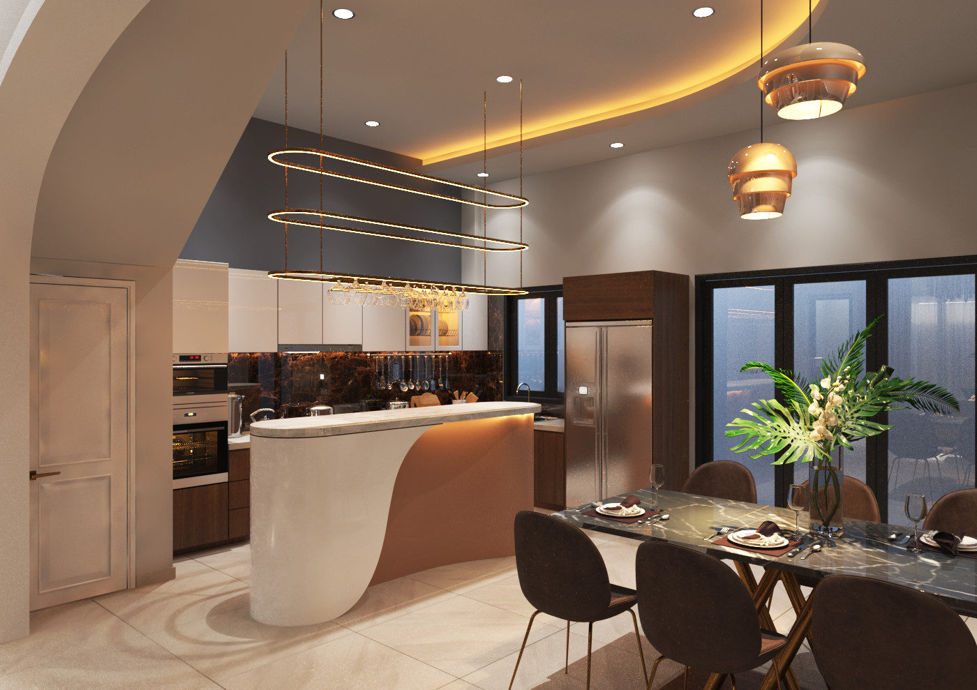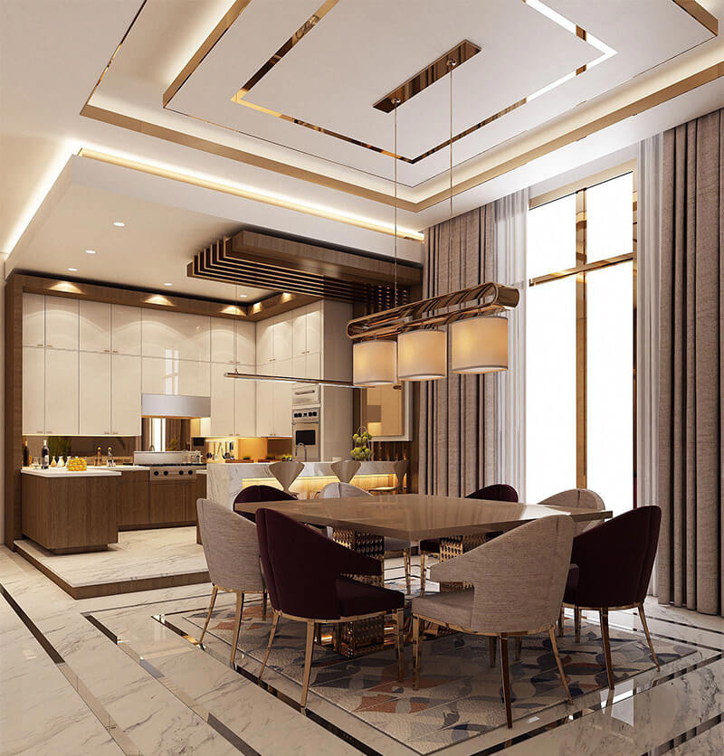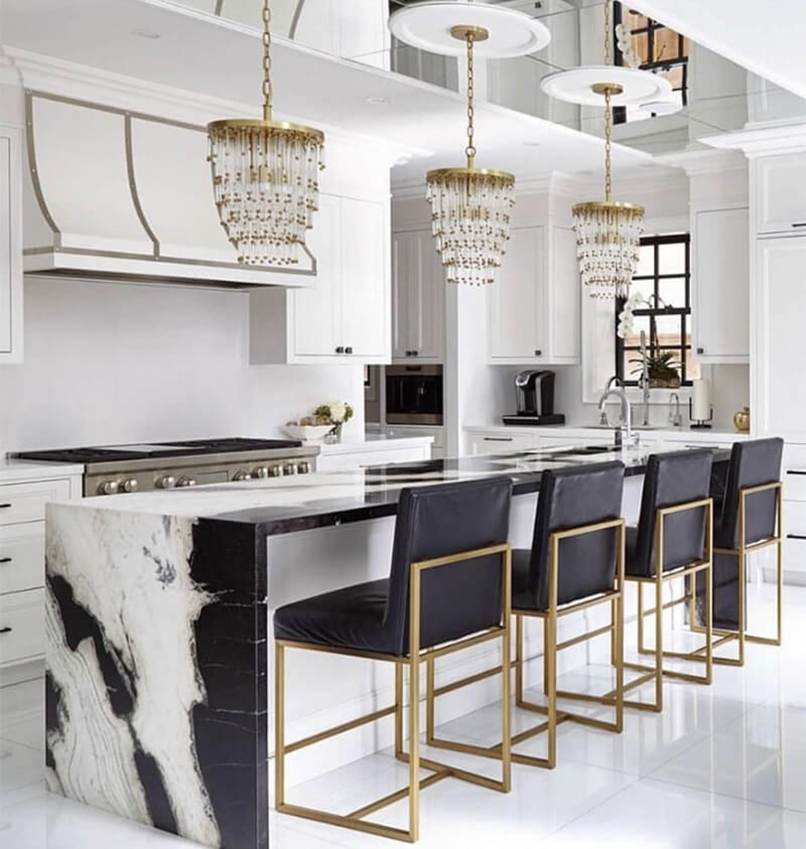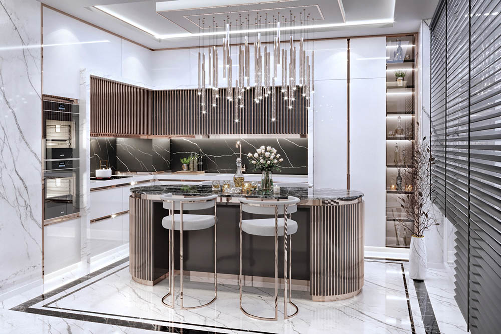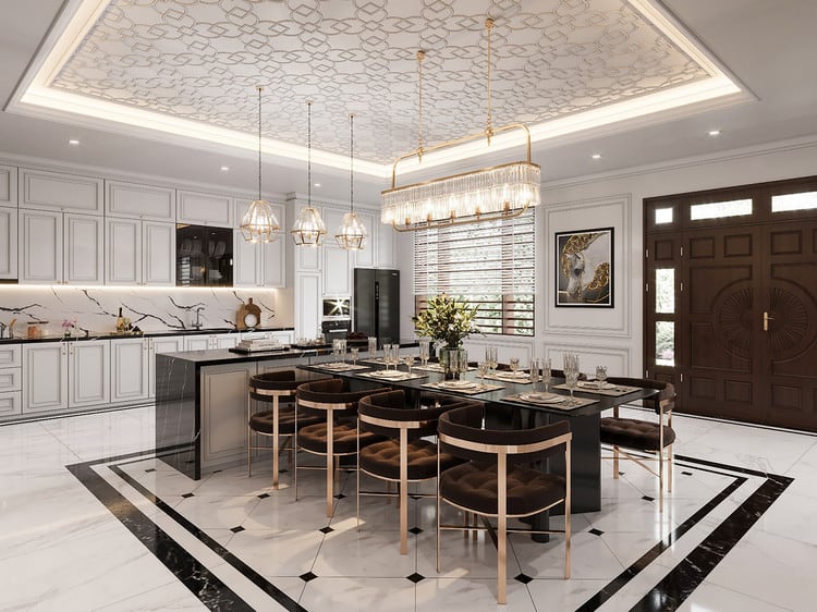 Nhằm tạo sự mới mẻ và sáng cho không gian nhà bếp, nên vật liệu đá cao cấp thường được sử dụng, ngoài ra nội thất mạ vàng lấp lánh cũng không thể thiếu bởi nó tôn lên vẻ đẹp kiêu kỳ nhưng vẫn đảm bảo không khí ấm cúng cho bữa cơm gia đình.