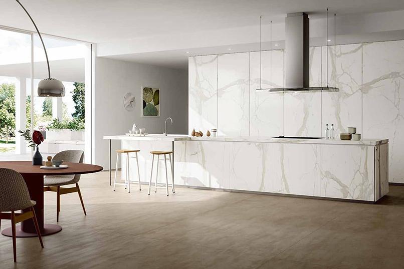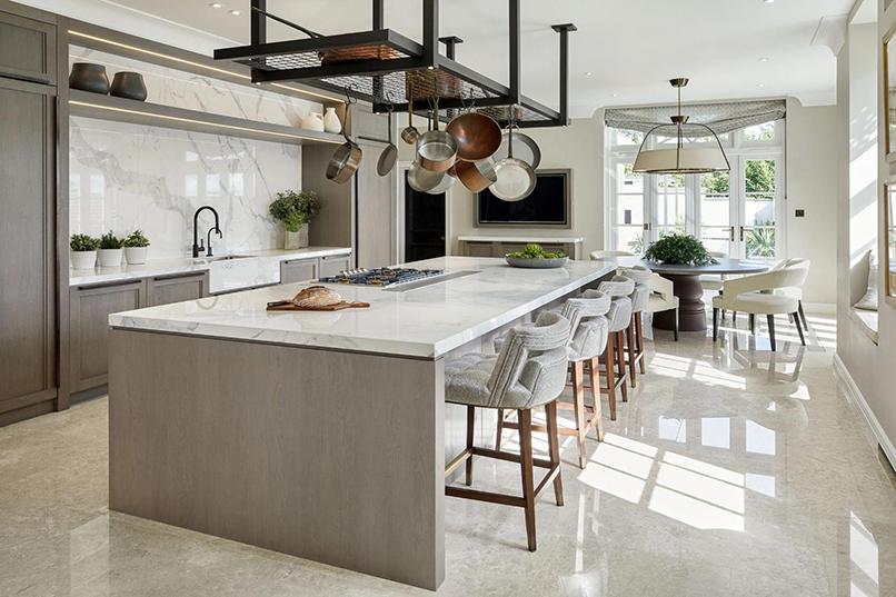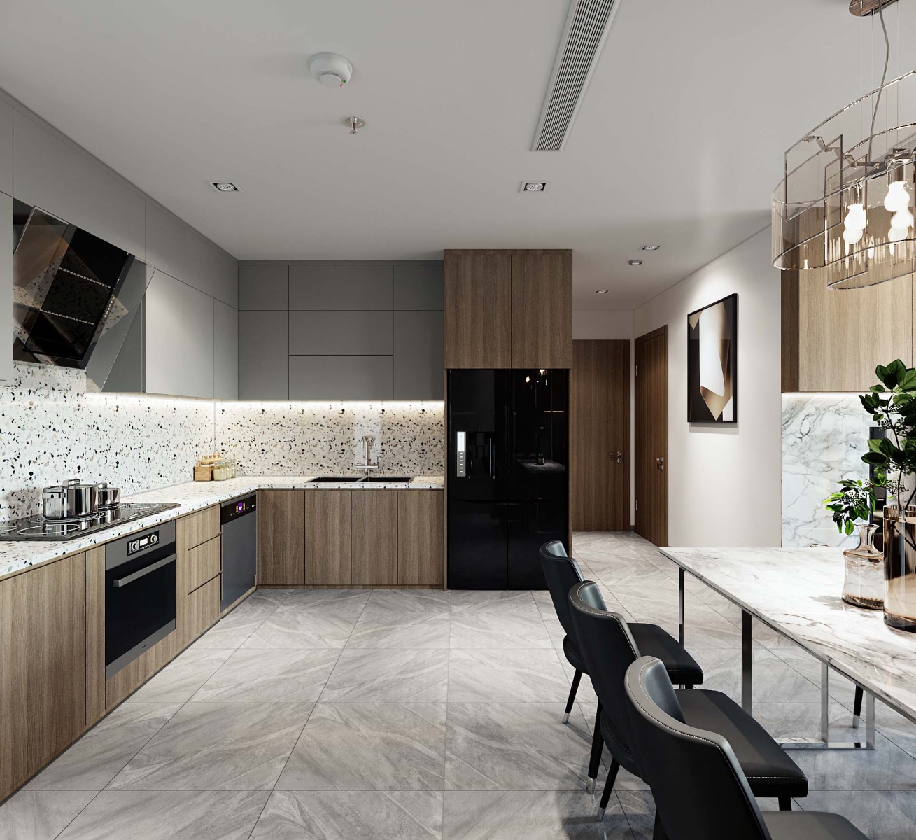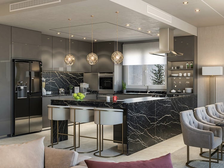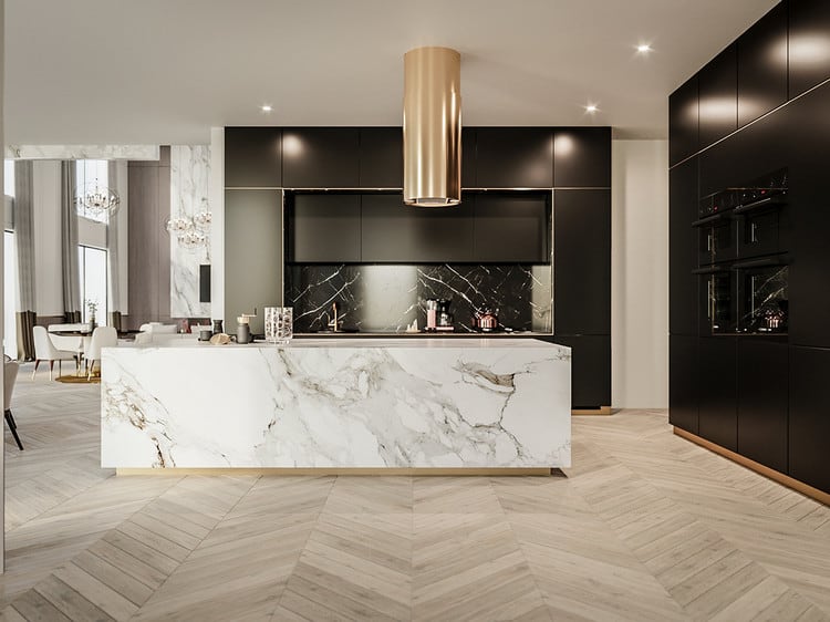 Nhằm tạo sự mới mẻ và sáng cho không gian nhà bếp, nên vật liệu đá cao cấp thường được sử dụng, ngoài ra nội thất mạ vàng lấp lánh cũng không thể thiếu bởi nó tôn lên vẻ đẹp kiêu kỳ nhưng vẫn đảm bảo không khí ấm cúng cho bữa cơm gia đình.