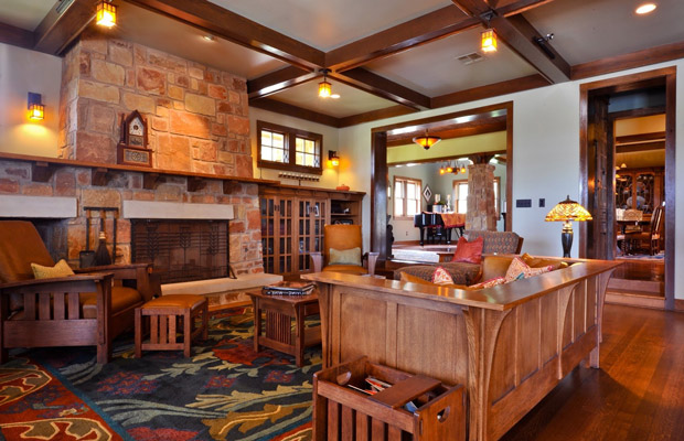 Phong cách Art & Crafts khi thiết kế phòng khách được làm nổi bật với nội thất bằng gỗ, chúng toát lên vẻ đẹp mộc mạc từ bàn tay của những nghệ nhân, chính nét mộc từ gỗ đã làm cho không gian thêm ấm cúng.