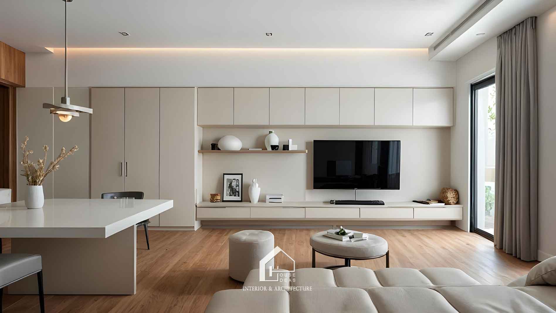 Phong cách tối giản (minimalist) tập trung vào việc loại bỏ các chi tiết rườm rà, chỉ giữ lại những yếu tố cần thiết. Sự kết hợp giữa màu sắc trung tính như trắng, xám, be và vật liệu cao cấp như gỗ, đá tự nhiên giúp không gian trở nên thanh lịch nhưng vẫn sang trọng.