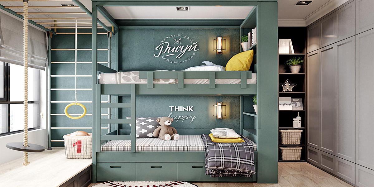Phòng ngủ cho một bé trai và một bé gái với thiết kế giường tầng