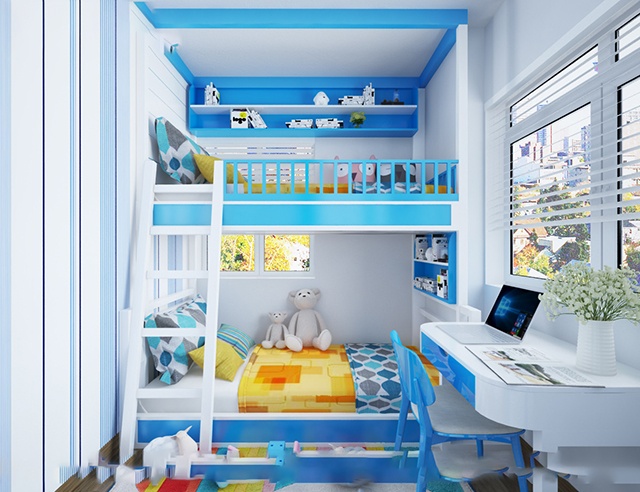 Chiếc giường trong mẫu thiết kế này được thiết kế thêm ngăn kéo để các bé có thể để cất những món đồ chơi yêu thích của mình, để tận dụng tối đa cho không gian của căn phòng thì chiếc tủ quần áo cũng được đặt âm tường.