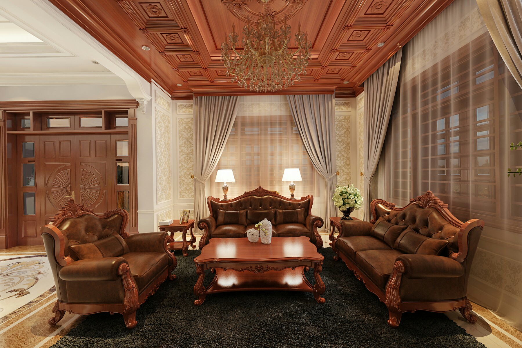 Màu sắc như vàng trắng, vàng kem, kem thường được sử dụng làm màu chủ đạo cho phong cách thiết kế này, bên cạnh đó các màu này được kết hợp cùng các màu khác như xanh, xanh rêu, đen, đỏ đô, đỏ booc-đô,… để làm nổi bật không gian sang trọng, quý phái.