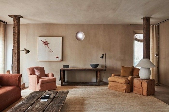 Cũng chính các món đồ nội thất sử dụng sẽ được ưu tiên làm từ gỗ và đá, những vật liệu thô, ít có sự can thiệp nhiều của máy móc và không tuân theo bất cứ chuẩn mực thẩm mỹ nào, vì vậy màu sắc của chúng được lưu giữ một cách "mộc". Nên các màu sắc được lấy từ thiên nhiên như màu của gỗ, màu của đất, mây tre, của cỏ cây hoa lá, sợi vải tự nhiên được sử dụng ở phong cách này.